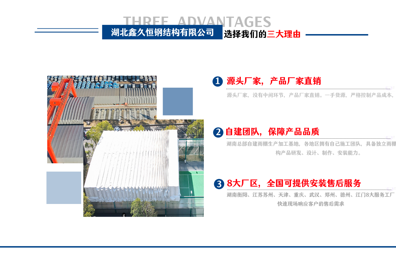 湖北鑫久恒鋼結構有限公司是一家電動雨棚、膜結構車棚研發,生產銷售,施工安裝于一體的專業鋼結構科技公司,主要產品有伸縮雨棚,電動雨棚,膜結構車棚等。 湖南地區職員目前有80多人,占地面積20000平方米,廠房面積15600平方米,配備先進的生產流水線,使每件品質產品的堅實基礎。 公司在蘇州、天津、重慶、武漢、德州、烏魯木齊、江門均設有服務工廠,總人員共300多人,擁有專業的技術團隊,配備先進的設備和流水線生產,產能高,貨源充足,發貨速度快,服務區域廣?! ∫苿由炜s棚適用于通道臨時倉儲、戶外運動遮陽、污水池遮蓋、能源交通、熱力化工、礦山、船舶制造及市政建設、物流、碼頭等領域的構件制作加工,成品半成品存放、倉庫、野外儀器設備操作用房等。尤其是對工廠發貨、倉儲臨時遮雨防嗮,梅雨期較長、建設周期較短的工程施工等特別適用。還可根據用戶需求量身定制、適合企業所需不同款式的產品?! ∥夜緢猿帧罢\信社會為本,客戶滿意為榮”的經營理念,做到質量把控,嚴格管理,精益求精,恪守承諾。使鑫久恒逐步走向成熟,其系統化、專業化日趨完善。以專業的技術、科學的管理,更高的產品質量,優良的企業信譽,真誠的客戶服務,靈活多樣的經營方式和務實創新的企業精神愿與社會各界攜手合作,為推動智能鋼結構建筑事業的發展而不斷努力。...